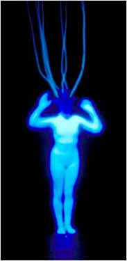 I looked down at my leg. A silver tube, six inches long, one inch in diameter, hung from my leg. At one end, a wire-thin antenna projected. From the other, a stainless-steel rod, perhaps a quarter-inch thick, stuck in my pants, then out again, two inches later, ending in a barbed point, like a harpoon of some kind. There was a clear fluid accumulating at the tip and I bent forward. The point was hollow.